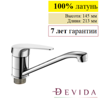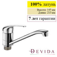 Devida Enzo DVL0302-04 cмеситель для кухни. Смеситель однорычажный для установки на мойку с верхним расположением ручки и креплением на гайке. Поворотный излив, длина которого 213 мм, высота 122 мм. В комплектацию входит качественная подводка Devida длиной 50 см с оплеткой из фибронейлона. Материал корпуса - латунь. Размер картриджа 40 мм.