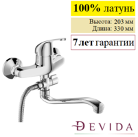 Devida Enzo DVL0322-04 cмеситель для ванны с поворотным изливом и наружным поворотным дивертором. Смеситель однорычажный для установки на стену. Длина поворотного излива 330 мм. Размер картриджа 40 мм. Материал корпуса - латунь. Душевая лейка с ситом диаметром 100 мм, шланг и кронштейн в комплекте.