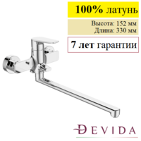 Devida Enzo DVL0323-04 cмеситель для ванны с поворотным изливом и встроенным поворотным дивертором. Смеситель однорычажный для установки на стену. Встроенный дивертор уменьшает количество резьбовых соединений и делает смеситель менее громоздким. Длина поворотного излива 330 мм. Размер картриджа 40 мм. Материал корпуса - латунь. Душевая лейка с ситом диаметром 100 мм, шланг и кронштейн в комплекте.