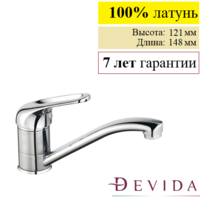 Devida Ersa DVL0303-02 cмеситель для кухни с коротким изливом. Смеситель однорычажный для установки на мойку с верхним расположением ручки и креплением на шпильке. Поворотный излив, длина которого 148 мм, высота 75 мм. В комплектацию входит качественная подводка Devida длиной 50 см с оплеткой из фибронейлона. Материал корпуса - латунь. Размер картриджа 40 мм.