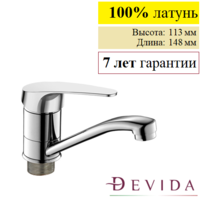 Devida Ersa DVL0304-02 cмеситель для кухни с коротким изливом. Смеситель однорычажный для установки на мойку с верхним расположением ручки и креплением на гайке. Поворотный излив, длина которого 148 мм, высота 75 мм. В комплектацию входит качественная подводка Devida длиной 50 см с оплеткой из фибронейлона. Материал корпуса - латунь. Размер картриджа 40 мм.