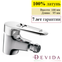 Devida Luro DVL0151-01 cмеситель для биде. Смеситель однорычажный для установки на биде с верхним расположением ручки и креплением на шпильке. Длина излива по осям корпус-аэратор 95 мм. В комплектацию входит качественная подводка Devida длиной 50 см с оплеткой из фибронейлона. Материал корпуса - латунь. Размер картриджа 40 мм.