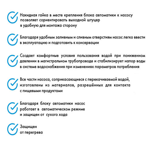 Все части насоса Джилекс Джамбо 70/50 П-К «Комфорт», соприкасающиеся с перекачиваемой водой, изготовлены из материалов, разрешённых для контакта с пищевыми продуктами. Благодаря удобным заливным и сливным отверстиям насос - автомат легко ввести в эксплуатацию и подготовить к консервации.