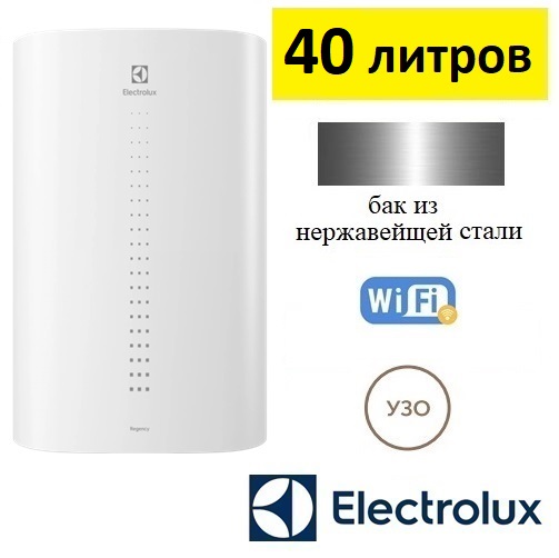 Electrolux EWH 40 Regency водонагреватель электрический объёмом 40 литров предназначен для нагрева воды в хозяйственно-бытовых целях. Бак водонагревателя из нержавеющей стали с высоким содержанием антикоррозионных элементов. При производстве внутренних баков применяется автоматическая аргонная сварка нового поколения. Модель даёт возможность подключения к Wi-Fi через USB-разъем для удаленного управления нагревом воды.