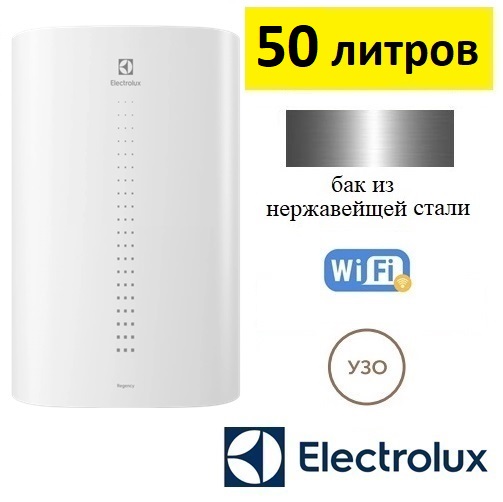 Electrolux EWH 50 Regency водонагреватель электрический объёмом 50 литров предназначен для нагрева воды в хозяйственно-бытовых целях. Бак водонагревателя из нержавеющей стали с высоким содержанием антикоррозионных элементов. При производстве внутренних баков применяется автоматическая аргонная сварка нового поколения. Модель даёт возможность подключения к Wi-Fi через USB-разъем для удаленного управления нагревом воды.