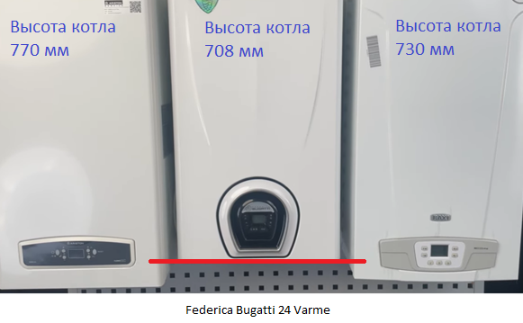 Стандартная высота котла мощностью 24 кВт составляет от 730-760 мм, из-за особенности размеров теплообменника для отопления и камеры сгорания. У газового котла Federica Bugatti 24 Varme размер по высоте всего 708 мм.