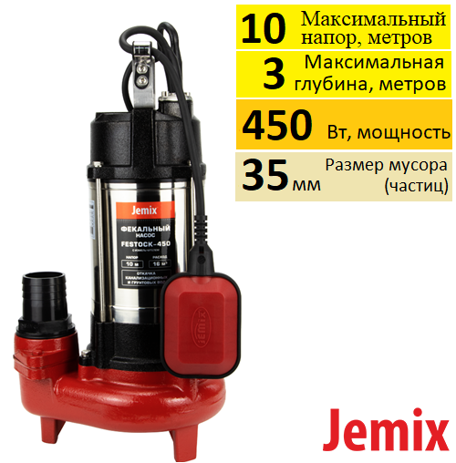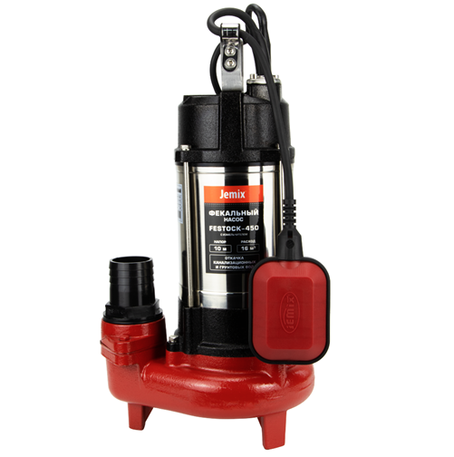 Jemix FESTOCK-450 фекальный насос, применяется в бытовых целях для откачивания фекальных, дренажных, дождевых и грунтовых вод из затопленных подвальных помещений, отвода канализационных, фильтрационных, отработанных, сильно загрязненных с органическими включениями вод из сточных канав и бассейнов; забора воды для полива, из разных водоемов; перекачивания пресной воды из колодцев.