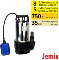 Jemix GSMAX-750 фекальный насос, применяется в бытовых целях для откачивания фекальных, дренажных, дождевых и грунтовых вод из затопленных подвальных помещений, отвода канализационных, фильтрационных, отработанных, сильно загрязненных с органическими включениями вод из сточных канав и бассейнов. Насос оснащен встроенным поплавковым выключателем, который автоматизирует работу прибора и повышает удобство использования в труднодоступных местах.