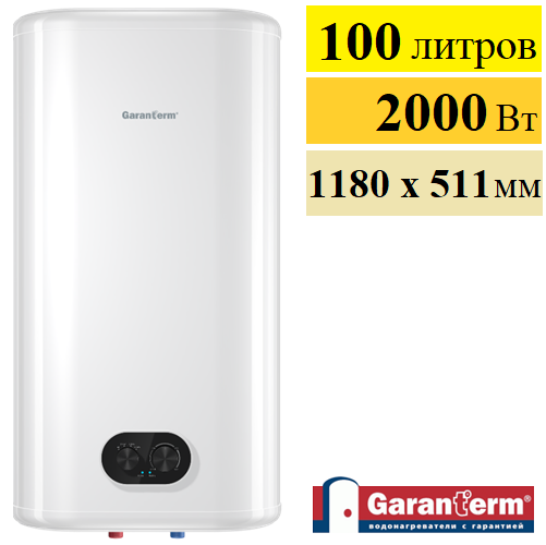 Garanterm Flat 100 V водонагреватель аккумуляционный электрический объёмом 100 литров с вертикальной установкой. Мощность 2000 Вт, время нагрева 157 минут. Внутренний бак изготовлен из нержавеющей стали. Пространство между внешним корпусом и внутренним баком заполнено низкотеплопроводным пенополиуретаном, что позволяет значительно снизить показатели энергопотребления. Водонагреватель имеет класс защиты от влаги и пыли IРХ4 - это доказывает долгосрочную работу во влажной среде.