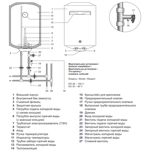 17. Комплект поставки: водонагреватель, предохранительный клапан 1 шт., руководство по эксплуатации 1 шт., упаковка 1 шт.