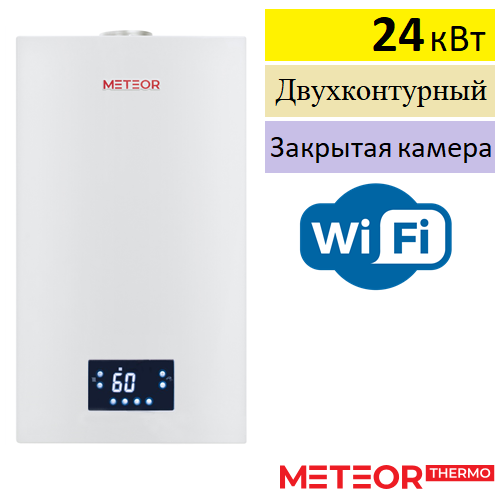 Meteor B20 24C газовый двухконтурный котёл мощностью 23.5 кВт, закрытая камера сгорания (турбированный). Служит для отопления и приготовления горячей воды в проточном режиме. Котёл изготовлен в Китае и протестирован на заводе Meteor Thermo в России.