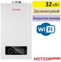 Meteor B30 32Н газовый одноконтурный котёл мощностью 32 кВт, закрытая камера сгорания (турбированный). Служит для отопления и приготовления горячей воды, с насосом отопительного контура, 3-ходовым клапаном для подключения бойлера косвенного нагрева и датчиком бойлера. Котёл изготовлен в Китае и протестирован на заводе Meteor Thermo в России.