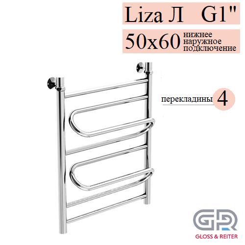 Gloss & Reiter Liza Л 50x60 Л2 Z2 G1 полотенцесушитель водяной, 4 перекладины, размер 500х600 мм, диаметр ДУ-25, выполняет сразу несколько функций - сушка мокрых полотенец и одежды, помогает избегать повышенной влажности в ванной; обеспечивает стабильную работу системы горячего водоснабжения ("компенсирующая петля"); работает как батарея отопления.