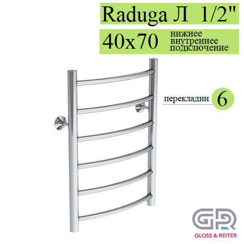 Gloss & Reiter Raduga Л 40х70 Д6 полотенцесушитель водяной, 6 перекладин, размер 400х700 мм, диаметр ДУ-15, выполняет сразу несколько функций - сушка мокрых полотенец и одежды, помогает избегать повышенной влажности в ванной; обеспечивает стабильную работу системы горячего водоснабжения ("компенсирующая петля"); работает как батарея отопления.