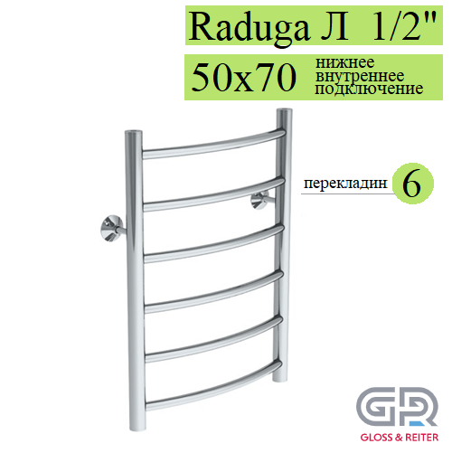 Gloss & Reiter Raduga Л 50х70 Д6 полотенцесушитель водяной, 6 перекладин, размер 500х700 мм, диаметр ДУ-15, выполняет сразу несколько функций - сушка мокрых полотенец и одежды, помогает избегать повышенной влажности в ванной; обеспечивает стабильную работу системы горячего водоснабжения ("компенсирующая петля"); работает как батарея отопления.