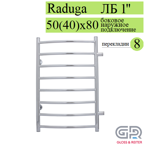 Gloss & Reiter Raduga LeRi ЛБ 50х80 Д8(40) полотенцесушитель водяной, 8 перекладин, межосевое расстояния 500 мм, ширина 400 мм, высота 800 мм, диаметр ДУ-25, выполняет сразу несколько функций - сушка мокрых полотенец и одежды, помогает избегать повышенной влажности в ванной; обеспечивает стабильную работу системы горячего водоснабжения ("компенсирующая петля"); работает как батарея отопления.