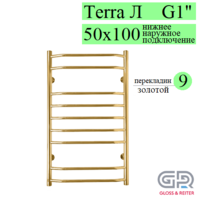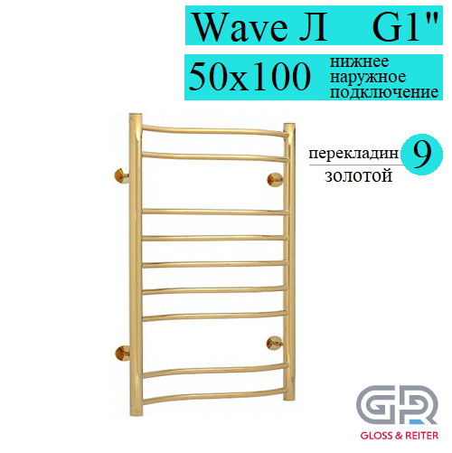 Gloss & Reiter Wave Л 50x100 В9 G1 (Gold) полотенцесушитель водяной, 9 перекладин, размер 500х1000 мм, диаметр ДУ-25, выполняет сразу несколько функций - сушка мокрых полотенец и одежды, помогает избегать повышенной влажности в ванной; обеспечивает стабильную работу системы горячего водоснабжения ("компенсирующая петля"); работает как батарея отопления.