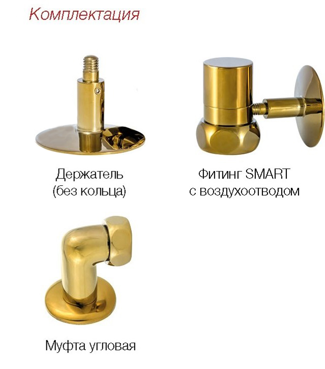 11. Комплектация: паспорт, упаковка, кран "Маевского", держатели-2 шт., соединительные углы 1"x3\4"-2 шт., защитные колпачки-4 шт., чаши декоративные-2 шт., полотенцесушитель.