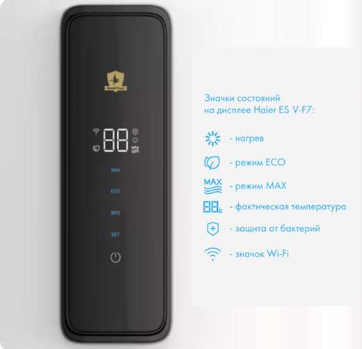 Haier ES50V-F7 водонагреватель электрический объёмом 50 литров с вертикальной установкой. Мощность 3000 Вт, время нагрева 53 минуты. Twin Power ускоряет нагрев воды благодаря работе двух ТЭНов. В водонагревателе используется специальная технология трехслойного покрытия, благодаря которой бак надежно защищен от коррозии. Технология Shock Proof защищает от утечек электрического тока и делает работу водонагревателя совершенно безопасной. Водонагревателю присвоен класс защиты от влаги и пыли IРХ4, что доказывает долгосрочную работу во влажной среде. Технология BPS защищает от бактерий, которые могут появиться в воде. Серия Haier ES V-F7 имеет современное управление режимами нагрева по Wi-Fi со смартфона и электронное на корпусе прибора, возможность подключения к системе умного дома.Управляйте водонагревателем прямо со смартфона из любой точки мира при помощи приложения HoN.
