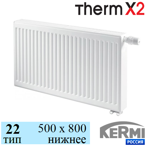 Kermi therm-x2 Profil Ventil FTV 22 500x800 радиатор стальной отопительный. Радиатор произведён в России на предприятии Kermi, по качеству и техническим характеристикам ничем не уступает немецким аналогам. Радиатор с нижним подключением, 22 тип, мощность радиатора 1544 Вт. Гарантия на радиатор 10 лет с момента продажи. Радиатор с технологией therm X2.