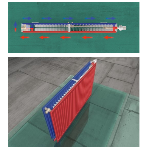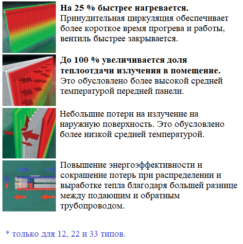 Уникальная запатентованная технология Х2 с последовательной обвязкой по теплоносителю делает следующее возможным: высокая энергоэффективность, существенно больше динамики и оптимальный тепловой комфорт в каждой рабочей точке. В начале нагревается передняя панель, а затем задняя панель радиатора, тем самым передняя панель служит источником обогрева, а задняя панель тепловым экраном.
