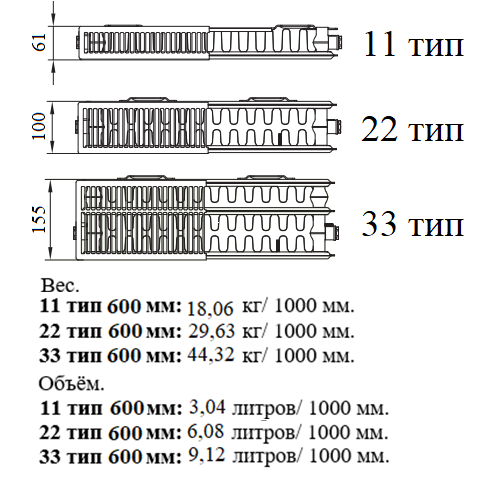 На заводе в России выпускаются радиаторы серии Profil типов 10, 11, 12, 20, 22, 30 и 33 с боковым или нижним подключением, длиной от 400 до 3000 мм, высотой 300, 400, 500, 600 и 900 мм.
