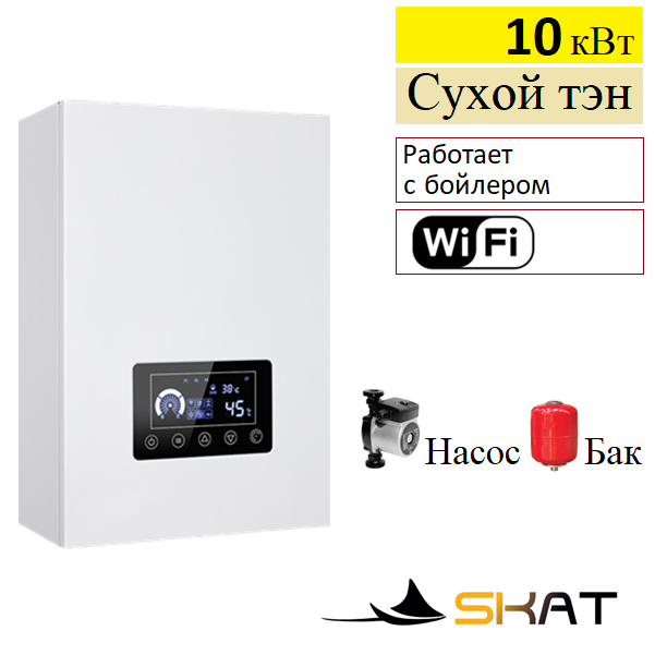 Skat Plus 10 электрический котёл мощностью 10 кВт. Котёл является миникотельной со встроенным насосом и расширительным баком. Предназначен котёл для отопления помещения до 100 м², а также организации приготовления горячей воды при установке внешнего бойлера косвенного нагрева.