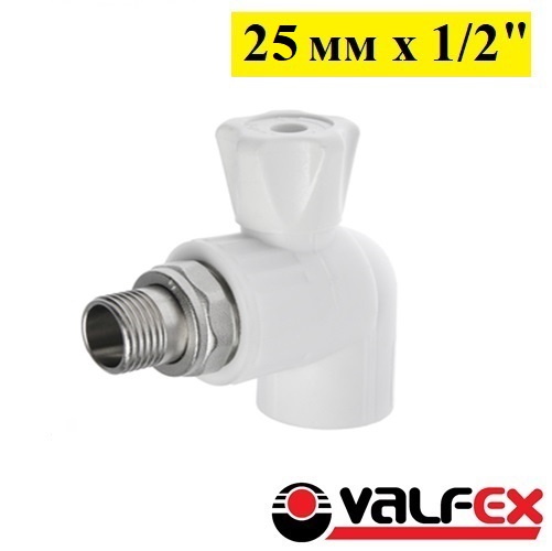 Кран шаровой для радиатора угловой в полипропиленовом корпусе диаметром 25 мм х 1/2" Valfex белого цвета, используется в системах водоснабжения и отопления в качестве запорной арматуры. Служит для соединения трубы и радиатора с боковым типом подключения. Производится методом литья под давлением, а латунные части производятся методом горячего штампования.