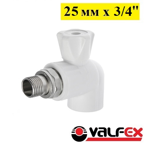 Кран шаровой для радиатора угловой в полипропиленовом корпусе диаметром 25 мм х 3/4" Valfex белого цвета, используется в системах водоснабжения и отопления в качестве запорной арматуры. Служит для соединения трубы и радиатора с боковым типом подключения. Производится методом литья под давлением, а латунные части производятся методом горячего штампования.