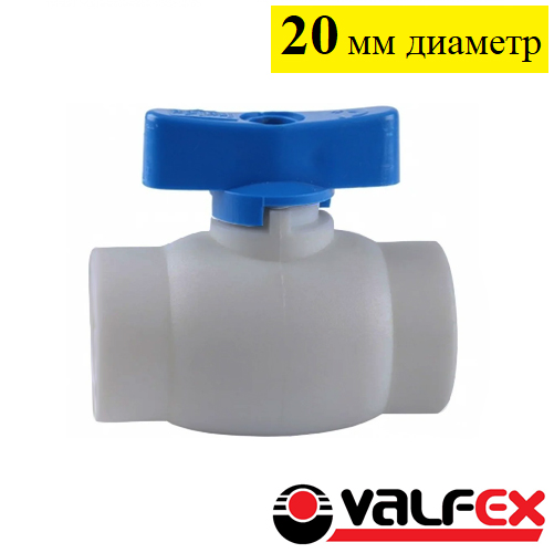 Кран шаровой полипропиленовый полупроходной с синей ручкой диаметром 20 мм Valfex серого цвета, используется в системах водоснабжения и отопления в качестве запорной арматуры. Диаметр проходного сечения крана уменьшен по сравнению с полнопроходным, что позволяет снизить поток. Производится методом литья под давлением.