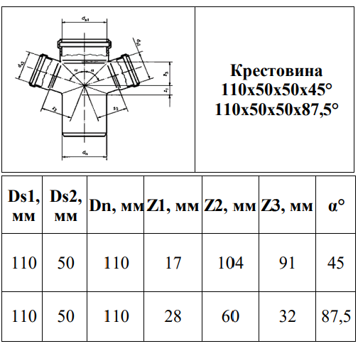 1. Крестовина одноплоскостная Valfex Prime 45° 110х50х50 мм - диаметры изделия 50 и 110 мм, угол 45 градусов.
