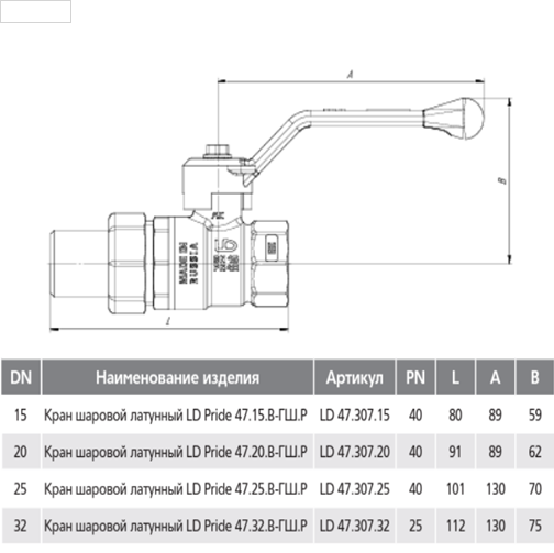 Паспорт. Кран шаровой LD Pride внутренняя резьба – гайка/штуцер.