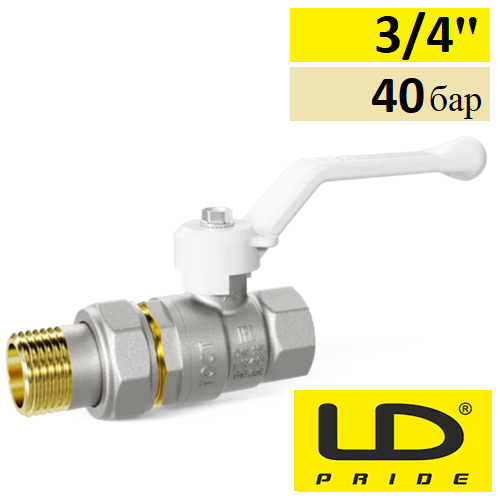 Кран шаровой LD Pride Ду 20 Ру 40 рычаг 47.20.В-ГШ.Р (белый) внутренняя резьба - американка, относится к типу неполнопроходных кранов, применяется в качестве запорной арматуры на трубопроводах систем хозяйственно-питьевого назначения и отопления. Предназначен для жидких сред, неагрессивных к материалам крана, а также пара. Кран сделан из высококачественной латуни с никелированным покрытием, что позволяет выдержать давление до 40 атмосфер, а температуру теплоносителя до +150 ˚С.