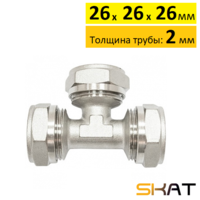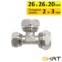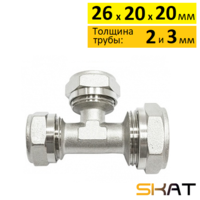 Муфта обжимная Skat 26х20 переходная, служит для соединения металлопластиковых труб разного диаметра 26х3 мм и 20х2 мм. Используется для открытого монтажа. Кроме соединения металлопласта этим фитингом можно соединять PEX и PE-RT трубы такого же диаметра и толщины стенки.