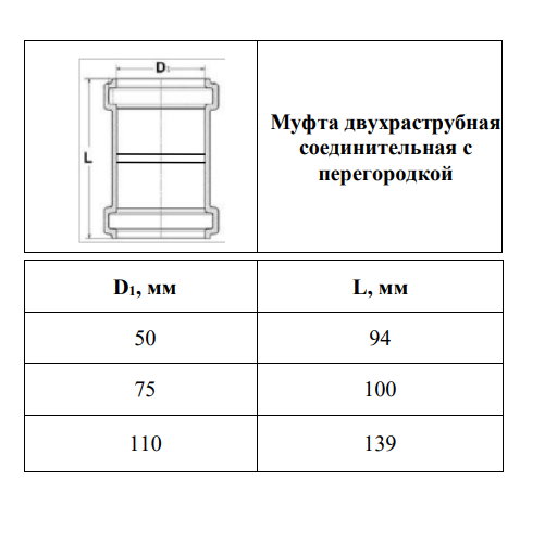 1. Муфта двухраструбная (с перегородкой) Valfex Prime 110 мм - диаметр изделия 110 мм, длина 139 мм .
