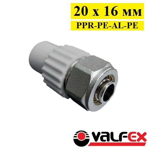 Ниппель комбинированный для соединения PPR-PE-AL-PE труб Valfex 20 х 16 мм серого цвета, предназначен для соединения полипропиленовой трубы либо фитинга с трубой из полиэтилена армированной алюминиевой фольгой (PEX/AL/PEX, PE-RT/AL/PE-RT). Производится методом литья под давлением, а латунные части производятся методом горячего штампования.