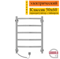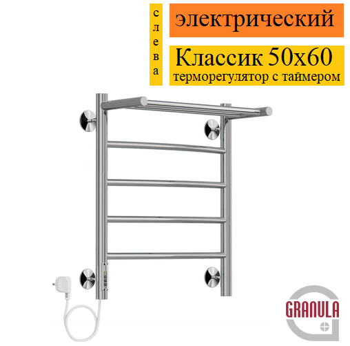 Granula Классик 50x60 с полкой терморегулятор с таймером слева D32 полотенцесушитель электрический, быстро нагревается при подключении к розетке с напряжением 220 В и медленно остывает, ускоряя сушку вещей. Имеет терморегулятор с таймером, что позволяет в определенное время нагреть помещение до желаемой температуры.