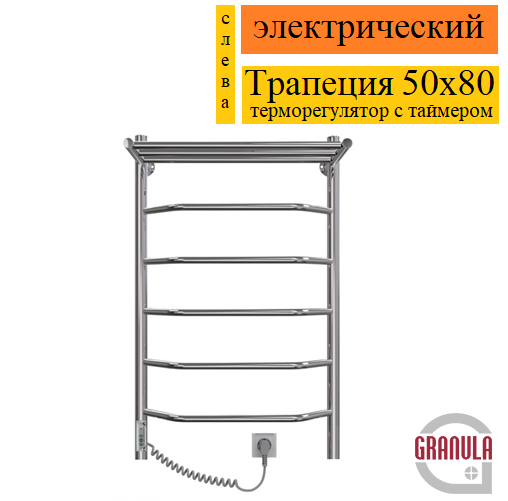 Granula Трапеция 50x80 с полкой терморегулятор с таймером слева D32 полотенцесушитель электрический, быстро нагревается при подключении к розетке с напряжением 220 В и медленно остывает, ускоряя сушку вещей. Имеет терморегулятор с таймером, что позволяет в определенное время нагреть помещение до желаемой температуры.