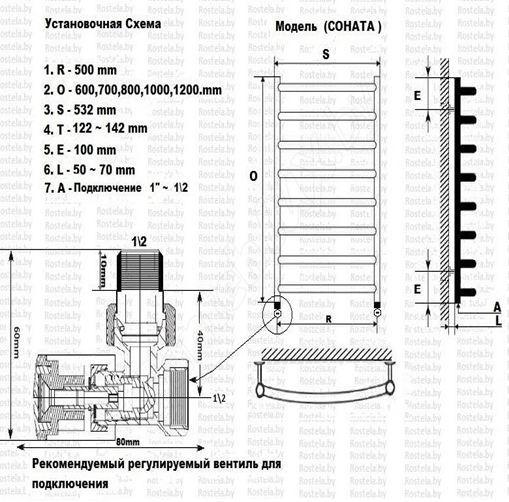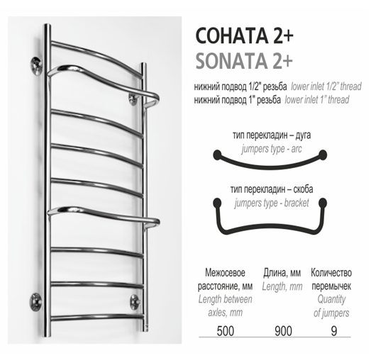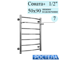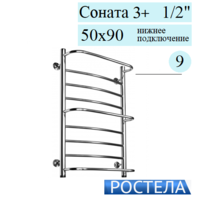 Rostela Соната 2+ 1/2 50x90, 9 перекладин, полотенцесушитель водяной, размер 500х900 мм, диаметр ДУ-15, выполняет сразу несколько функций - сушка мокрых полотенец и одежды, помогает избегать повышенной влажности в ванной; обеспечивает стабильную работу системы горячего водоснабжения ("компенсирующая петля"); работает как батарея отопления. В комплект входят крепления к стене.