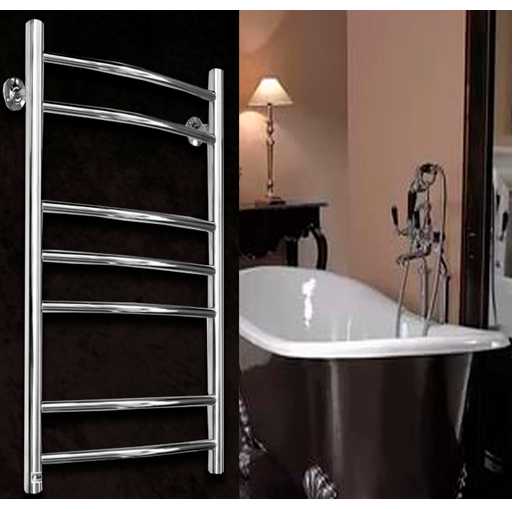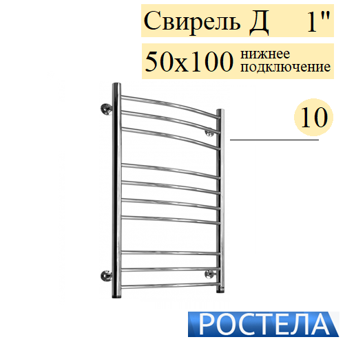 Rostela Свирель Д 1 50x100, 10 дугообразных перекладин, полотенцесушитель водяной, размер 500х1000 мм, диаметр ДУ-25, выполняет сразу несколько функций - сушка мокрых полотенец и одежды, помогает избегать повышенной влажности в ванной; обеспечивает стабильную работу системы горячего водоснабжения ("компенсирующая петля"); работает как батарея отопления. В комплект входят крепления к стене.