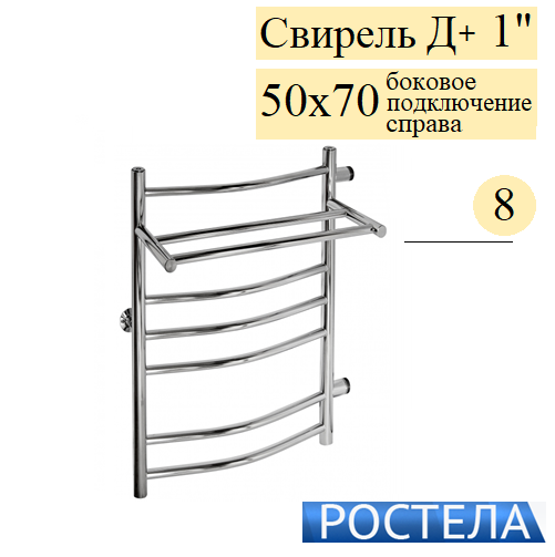Rostela Свирель Д+ 1 50x70, 8 дугообразных перекладин, полотенцесушитель водяной, размер 500х700 мм, диаметр ДУ-25, выполняет сразу несколько функций - сушка мокрых полотенец и одежды, помогает избегать повышенной влажности в ванной; обеспечивает стабильную работу системы горячего водоснабжения ("компенсирующая петля"); работает как батарея отопления. В комплект входят крепления к стене.