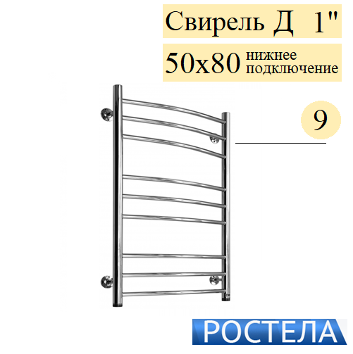 Rostela Свирель Д 1 50x80, 9 дугообразных перекладин, полотенцесушитель водяной, размер 500х800 мм, диаметр ДУ-25, выполняет сразу несколько функций - сушка мокрых полотенец и одежды, помогает избегать повышенной влажности в ванной; обеспечивает стабильную работу системы горячего водоснабжения ("компенсирующая петля"); работает как батарея отопления. В комплект входят крепления к стене.