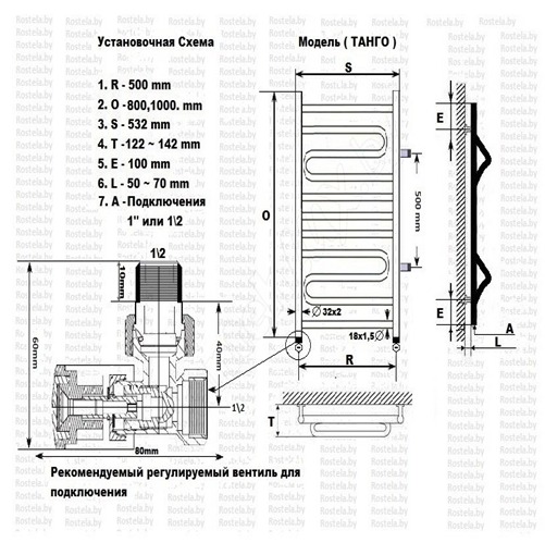 Rostela Танго-2 1 50x100, 11 перекладин, полотенцесушитель водяной, размер 500х1000 мм, диаметр ДУ-25, выполняет сразу несколько функций - сушка мокрых полотенец и одежды, помогает избегать повышенной влажности в ванной; обеспечивает стабильную работу системы горячего водоснабжения ("компенсирующая петля"); работает как батарея отопления. В комплект входят крепления к стене.