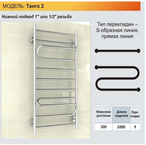 Rostela Танго-2 1 50x100, 11 перекладин, полотенцесушитель водяной, размер 500х1000 мм, диаметр ДУ-25, выполняет сразу несколько функций - сушка мокрых полотенец и одежды, помогает избегать повышенной влажности в ванной; обеспечивает стабильную работу системы горячего водоснабжения ("компенсирующая петля"); работает как батарея отопления. В комплект входят крепления к стене.
