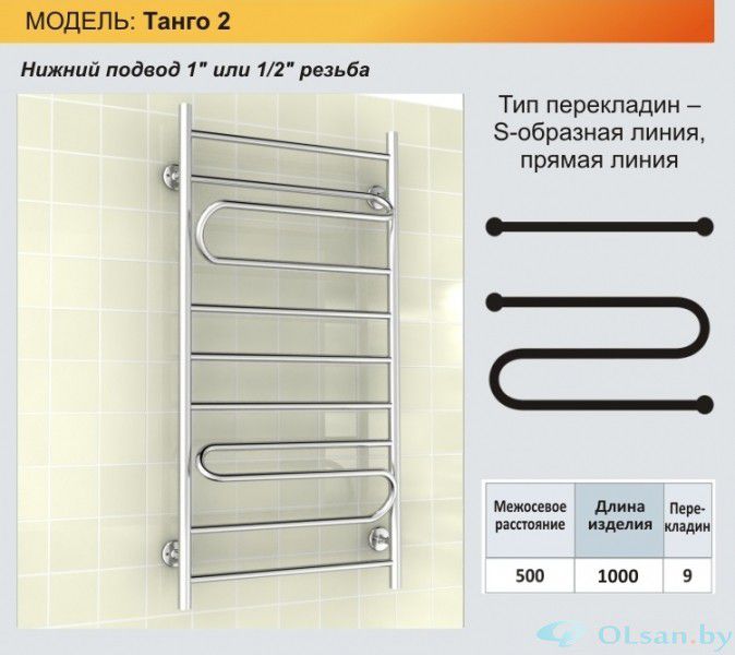 Rostela Танго-2 1/2 50x100, 11 перекладин, полотенцесушитель водяной, размер 500х1000 мм, диаметр ДУ-15, выполняет сразу несколько функций - сушка мокрых полотенец и одежды, помогает избегать повышенной влажности в ванной; обеспечивает стабильную работу системы горячего водоснабжения ("компенсирующая петля"); работает как батарея отопления. В комплект входят крепления к стене.