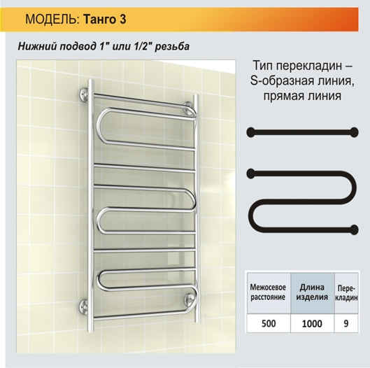 Rostela Танго-3 1/2 50x100, 11 перекладин, полотенцесушитель водяной, размер 500х1000 мм, диаметр ДУ-15, выполняет сразу несколько функций - сушка мокрых полотенец и одежды, помогает избегать повышенной влажности в ванной; обеспечивает стабильную работу системы горячего водоснабжения ("компенсирующая петля"); работает как батарея отопления. В комплект входят крепления к стене.