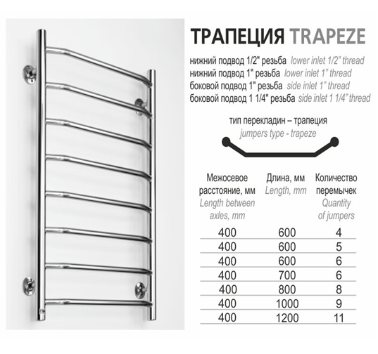 Полотенцесушитель водяной Rostela Трапеция 1/2 40x60-4 нижнее подключение