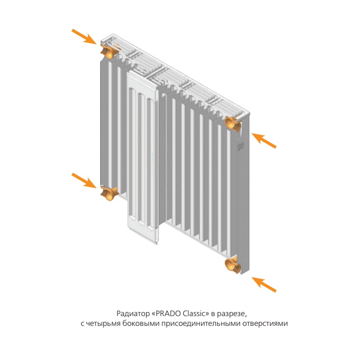 Радиаторы Classic 11х300х500 (Прадо Классик) относятся к типу с боковым подключением. Они имеют четыре боковых патрубка с внутренней резьбой 1/2". Панельные радиаторы Prado также оснащены воздуховыпускной решеткой и боковыми стенками, что придает внешнему виду изделия эстетичность и завершенность.