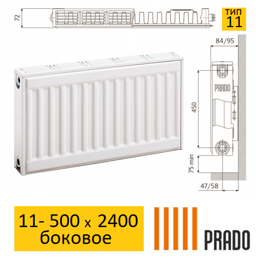 Радиаторы Classic 11х500х2400 (Прадо Классик) относятся к типу с боковым подключением. Они имеют четыре боковых патрубка с внутренней резьбой 1/2". Панельные радиаторы Prado также оснащены воздуховыпускной решеткой и боковыми стенками, что придает внешнему виду изделия эстетичность и завершенность.