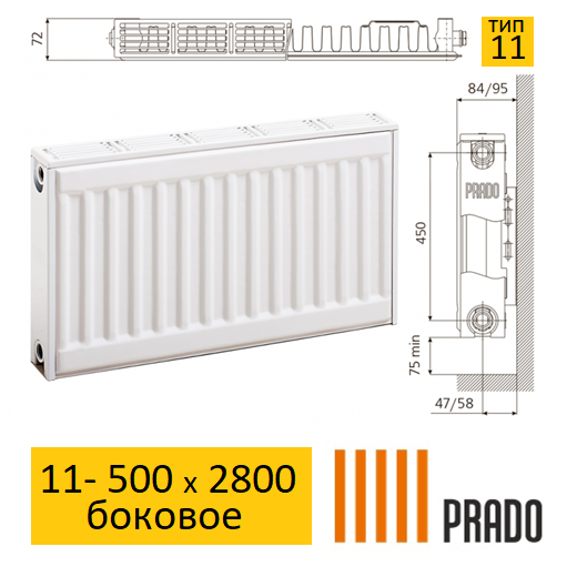 Радиатор стальной панельный Prado Classic 11х500х2800 - это отопительный прибор мощностью 3429 Вт, который служит для отопления жилых, общественных и промышленных зданий с закрытой системой отопления (в такой системе отопления теплоноситель не имеет контакта с атмосферным воздухом).